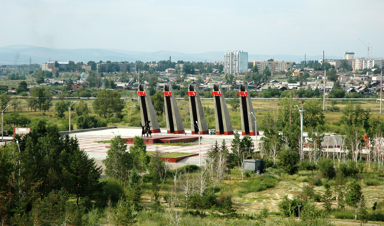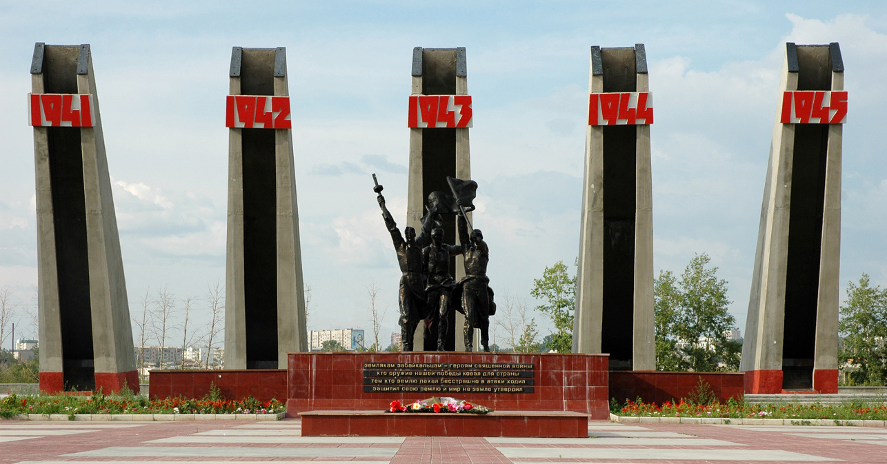 Грандиозный мемориал в Центральном парке Читы символизирует союз бойцов и рабочих. Здесь увековечен подвиг 175 тысяч забайкальцев, сражавшихся на фронтах и трудившихся в тылу.