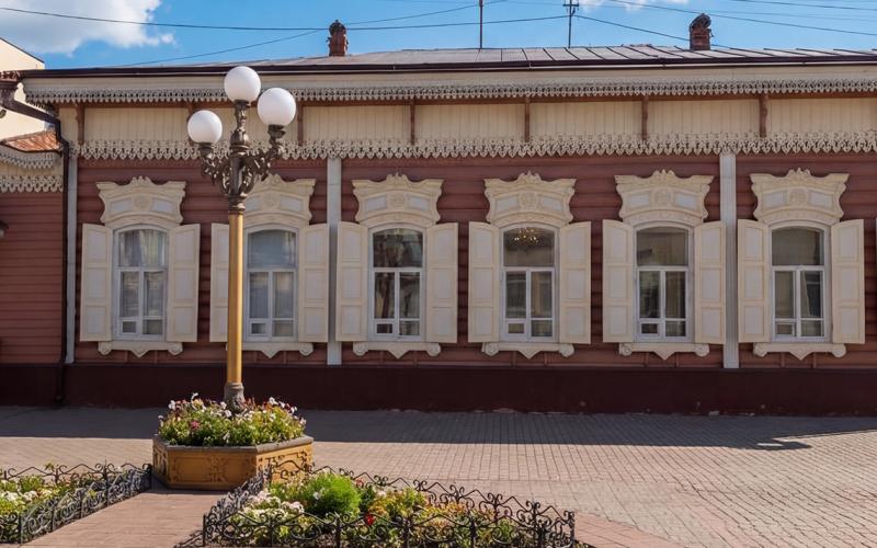 Дом на пешеходном участке улицы Ленина — образец эклектики начала XX века. Мощные фигуры атлантов, арочные окна, кованые балконы и рустовка создают образ столичной роскоши в сердце Верхнеудинска.