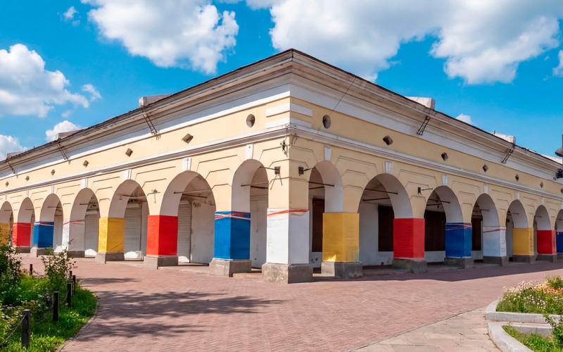 Классический образец купеческой архитектуры XIX века. Долгое время «дом с лавками» считался самым престижным торговым местом города, а его мезонин служил первой частной гостиницей.