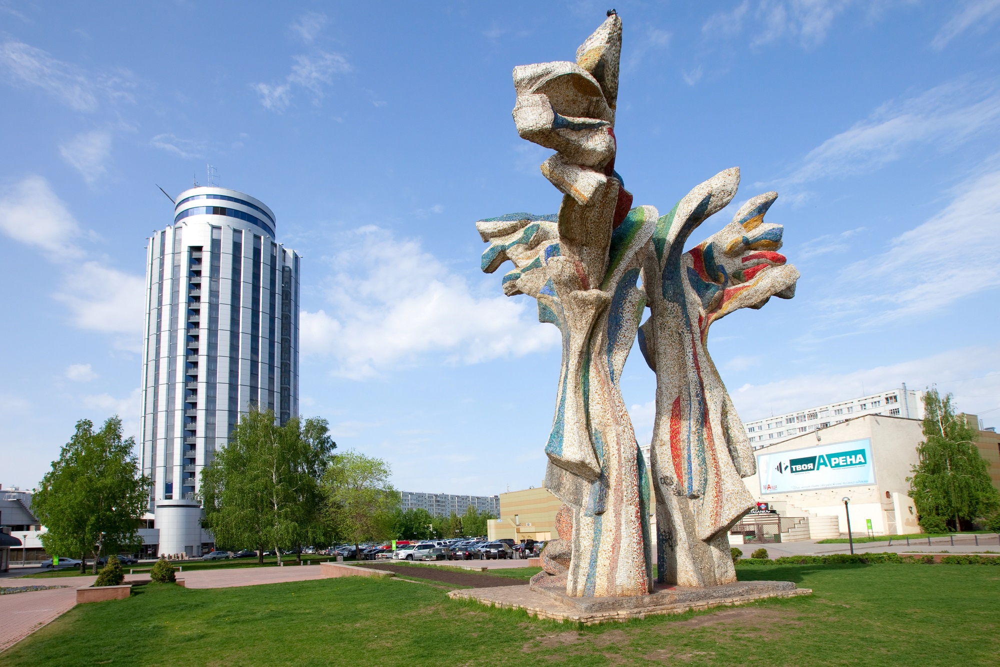 В первой половине 1970-х годов по проекту архитектора Бориса Рафаиловича Рубаненко на проспекте 50-летия СССР решили построить гостиницу на 564 места. Предполагалось возвести 25-этажное круглое и полностью монолитное здание высотой в 81 метр. Но в середине 1980-х годов стройку заморозили из-за недостатка финансирования. К тому времени уже был полностью возведен бетонный каркас. Городские власти решили преобразить здание: верхний этаж, представляющий собой цилиндрический выступ, покрасили в цвета флага Татарстана. За столь необычный декор горожане прозвали здание «тюбетейкой».
