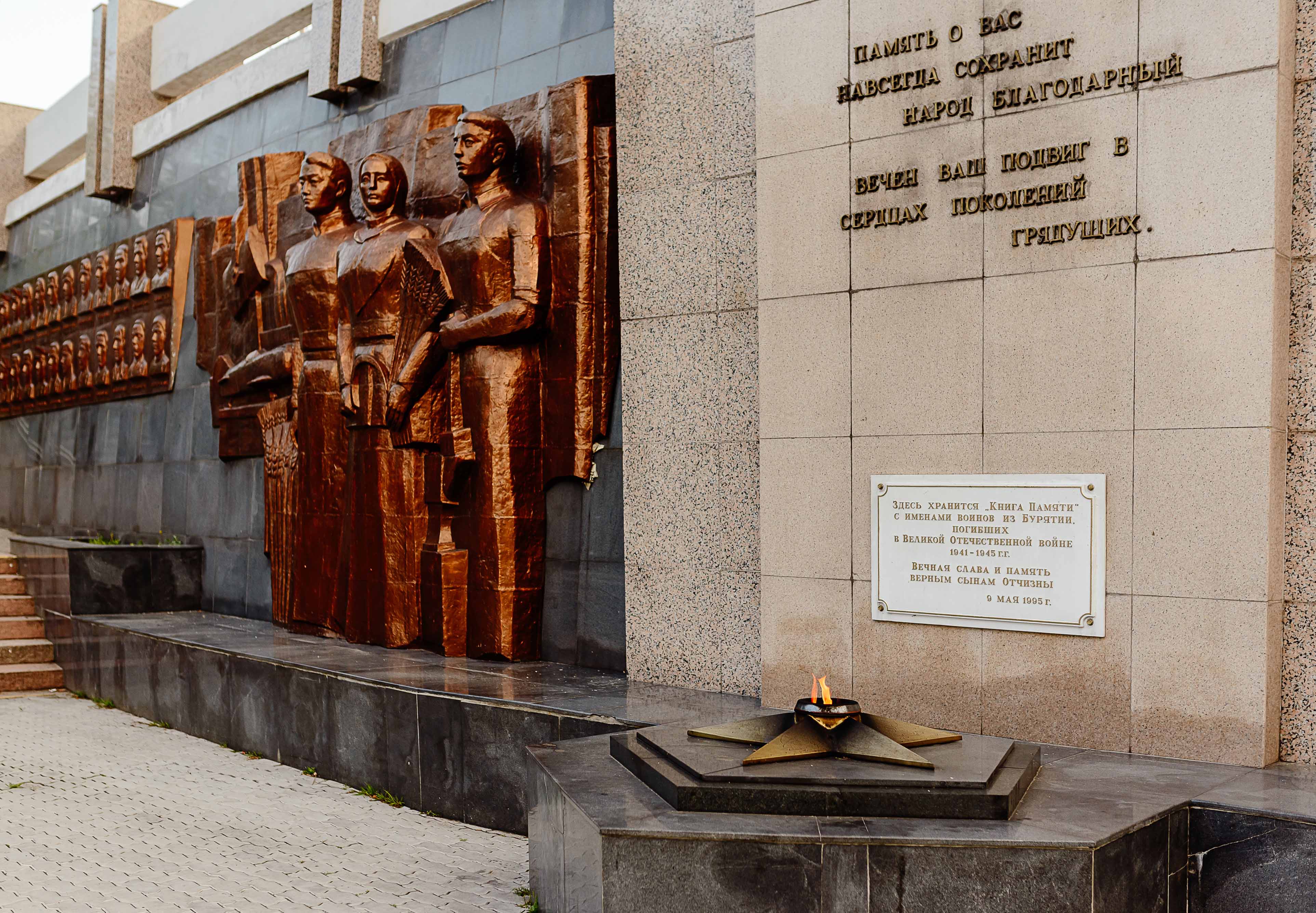 Сейчас мемориал представляет собой комплекс объектов, который включает легендарный танк Т-34, размещённый на четырёхметровом каменном постаменте, и Стену Памяти с барельефной композицией работы скульптора Александра Миронова, изображающей советских солдат и тружеников тыла. Здесь же установлены бронзовые портреты Героев Советского Союза из Бурятии. У постамента размещён Вечный огонь, к которому ежегодно возлагают венки и цветы руководители республики, города, представители трудовых коллективов и жители Бурятии.