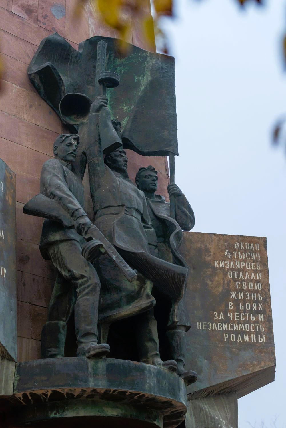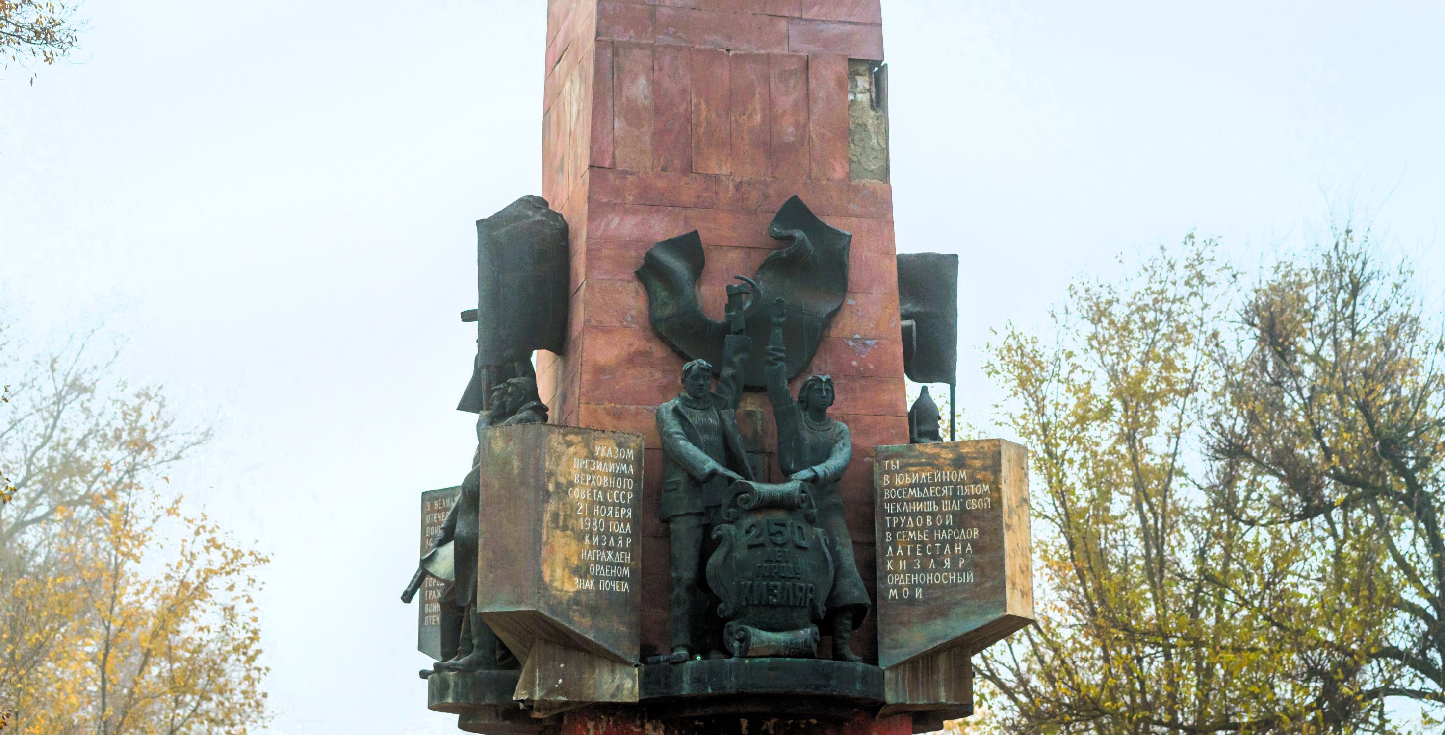Фигуры рабочего и колхозницы с флагом, помещенные в центр композиции, по-видимому, олицетворяют образ советской эпохи. Надпись на плите с правой стороны гласит, что в 1980 году город наградили орденом «Знак Почета», а на левой выгравированы строки: «Ты в юбилейном восемьдесят пятом чеканишь шаг свой трудовой в семье народов Дагестана, Кизляр орденоносный мой».