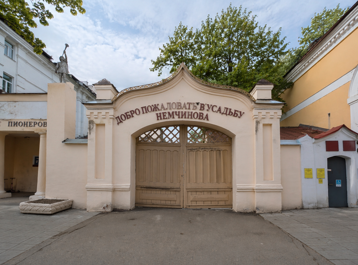 Массивные красивые ворота соединяли главный дом усадьбы с двухуровневыми каменными кладовыми — там располагались торговые лавки и склады, а также помещения, сдаваемые в аренду. Кладовые были построены в 1882 году.